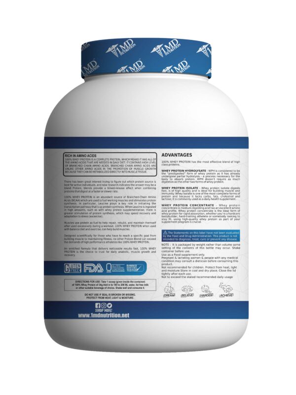 100% WHEY PROTEIN IS A COMPLETE PROTEIN, WHICH MEANS IT HAS ALL OF THE AMINO ACIDS THAT ARE NEEDED IN DAILY DIET. IT CONTAINS HIGH LEVEL OF BRANCHED CHAIN AMINO ACIDS. BRANCHED CHAIN AMINO ACIDS ARE UNLIKE OTHER AMINO ACIDS IN THE PROMOTION OF MUSCLE GROWTH BECAUSE THEY CAN BE METABOLIZED DIRECTLY INTO MUSCLE TISSUE.